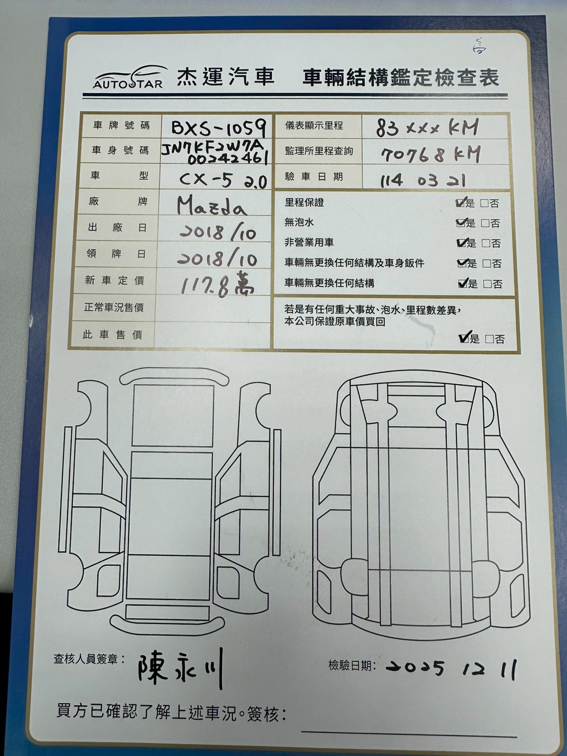 2018年10出廠 2024年03月28日領牌 實車里程:83568公里