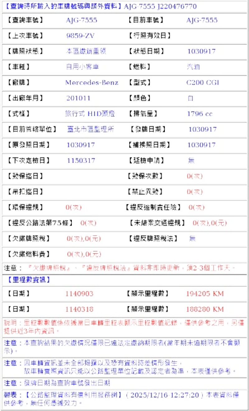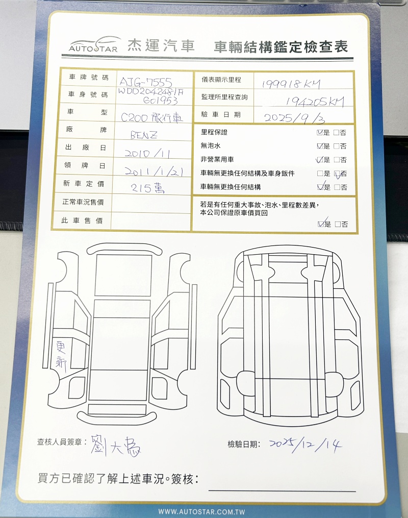 2010年11月出廠 2011年 1月21日領牌 實車里程:199926公里