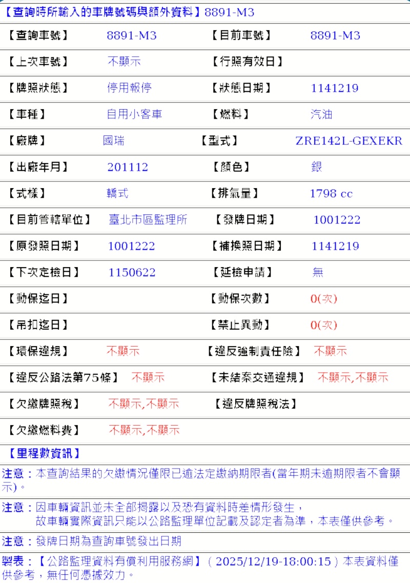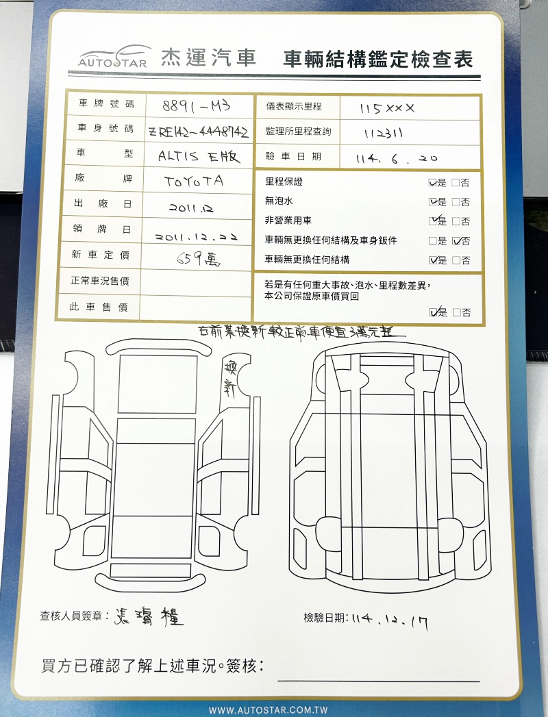 2011年12月出廠 2011年 12月22日領牌 實車里程:115727公里