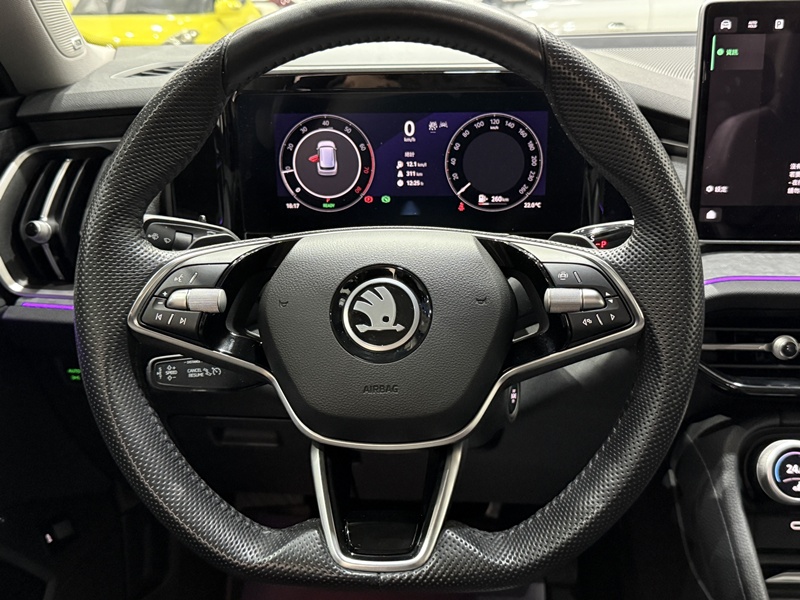 全新Kodiaq在外觀設計上融入了Skoda最新的「Modern Solid」設計語言,使整體外觀更加大器且充滿現代感。該車型採用了大面積的前格柵設計,搭配動感十足的車身線條,貫穿車身的肩線不僅增強了車輛的氣勢,還讓整體造型顯得更加修長。車側的Tornado線條更是畫龍點睛,使車身更加動感優雅。車頂線條經過精心設計,結合空氣動力學的精準計算,創造出僅僅Cd 0.282 的低風阻係數,不僅能有效降低了行駛過程中的空氣阻力,更進一步提升燃油效率,為駕駛者帶來更加流暢的駕駛體驗。車頭獨樹一格的晶鑽鍊燈組車頭護罩以14顆LED發光極體結合新世代家族化八角型水箱護罩,營造出貫穿式光帶的視覺效果,突顯了照明的科技感。頭燈冰晶箭矢與尾燈的冰焰紋造型燈飾,其設計靈感源自波希米亞水晶藝術工藝,加上左右前車門的LED迎賓照地光毯,細緻的為車輛增添了奢華感。此外,在Skoda品牌標誌與車身D柱更是首見採用全新霧鉻銀 (Unique Dark Chrome) 飾面,是此次設計中的一大創新,新材質的使用不僅更為車身增添質感和現代感,且製程更有善於環境保護。Kodiaq不僅延續了品牌一貫的穩重大氣風範,還通過一系列精粹的升級,賦予其更多現代感與動感元素,使其成為都市中兼具風格與實用性的完美座駕。