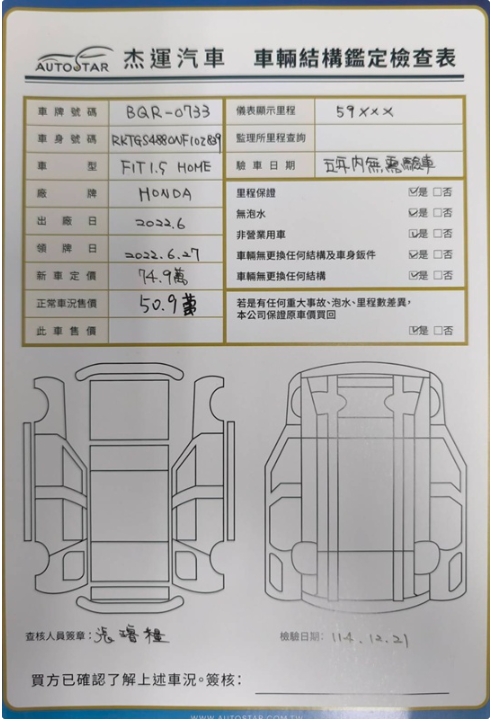 2022年06出廠 2022年06月27日領牌 實車里程:59827公里