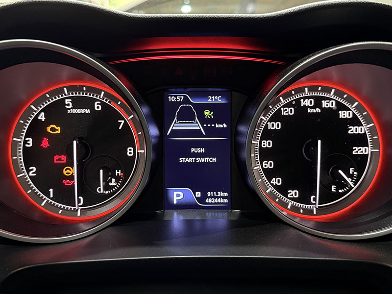 Suzuki Swift 1.2 GLX 以雙筒式運動風儀錶搭配中央 4.2 吋彩色 LCD 資訊幕驚艷不已,能即時顯示油電系統能量流向與行車資訊,搭配標配的 7 吋觸控式螢幕,支援 Apple CarPlay 與 Android Auto 智慧連結,賦予座艙空間濃厚強烈的科技氛圍。而其亦全面採用感應式引擎啟動系統,無須拿出鑰匙,僅需按下位於儀錶台側邊的紅色 Start 按鈕即可發動/關閉引擎!