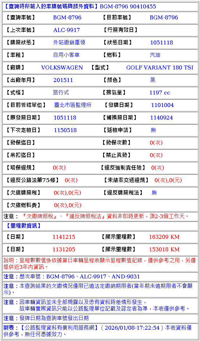 2015年11月出廠 2016年06月21日領牌 實車里程:163714公里