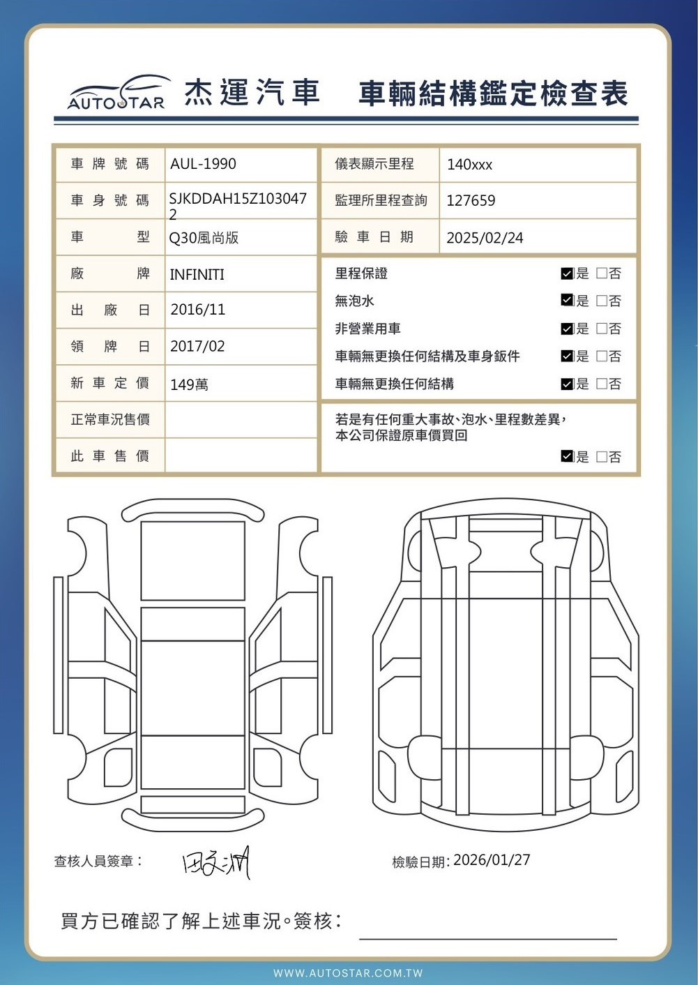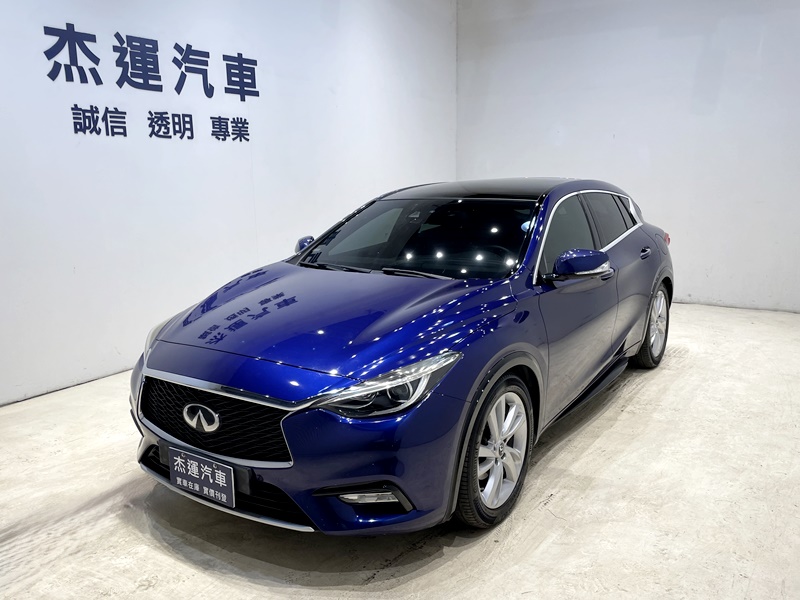 亮點: 2017年款Infiniti Q30 1.6T風尚版是一款豪華小型掀背跨界車,搭載1.6升渦輪增壓直列4缸引擎,可輸出約156hp最大馬力與25.5kg·m扭力,搭配7速雙離合器自手排變速箱與前輪驅動設定,平均油耗約14.7 km/L。車身為5門5人座掀背設計,外型融合掀背靈活與休旅跨界動感風格。標配18吋鋁圈、LED燈組與豪華內裝,內裝有全景天窗、雙區恆溫、方向盤快控、Nappa皮質座椅等舒適配備。安全方面具備全車標配7氣囊與多項主動安全科技,Euro NCAP評價高達5顆星,表現出色。2017年式並新增Push Start啟動按鈕,但維持原本售價不變。