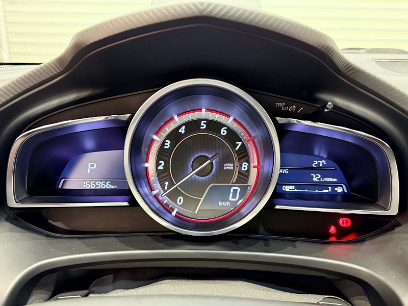 Mazda 3座艙為進化過的駕駛導向環境,坐進車室,明顯可以感受到濃郁的跑車化設定氛圍,一切的功能操作都以駕駛人為導向,但是卻沒有過往跑車戰鬥化座艙過度的侷促感。坐在駕駛座上視野往前延伸至儀錶,可以看到以轉速為主的單一指針式儀錶,時速則以較小的液晶顯示。最優化的儀錶高度,帶來了開闊又不失安全的視覺感。而隨著發動引擎,儀錶上方的Active Driving Display抬頭顯示屏會緩緩升起,在行駛間提供必要的行車資訊,科技感十足。