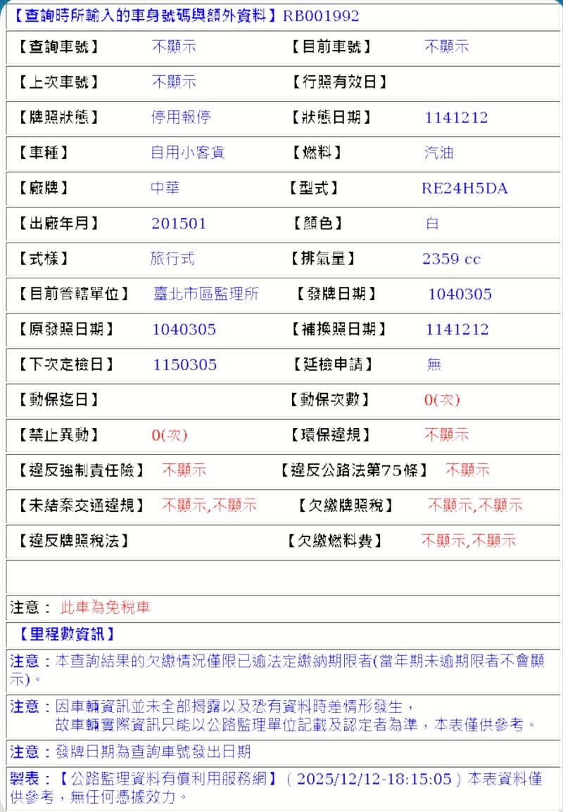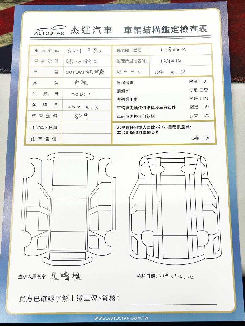 2015年01月出廠 2015年 03月05日領牌 實車里程:148916公里