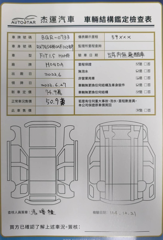 2022年06出廠 2022年06月27日領牌 實車里程:59780公里