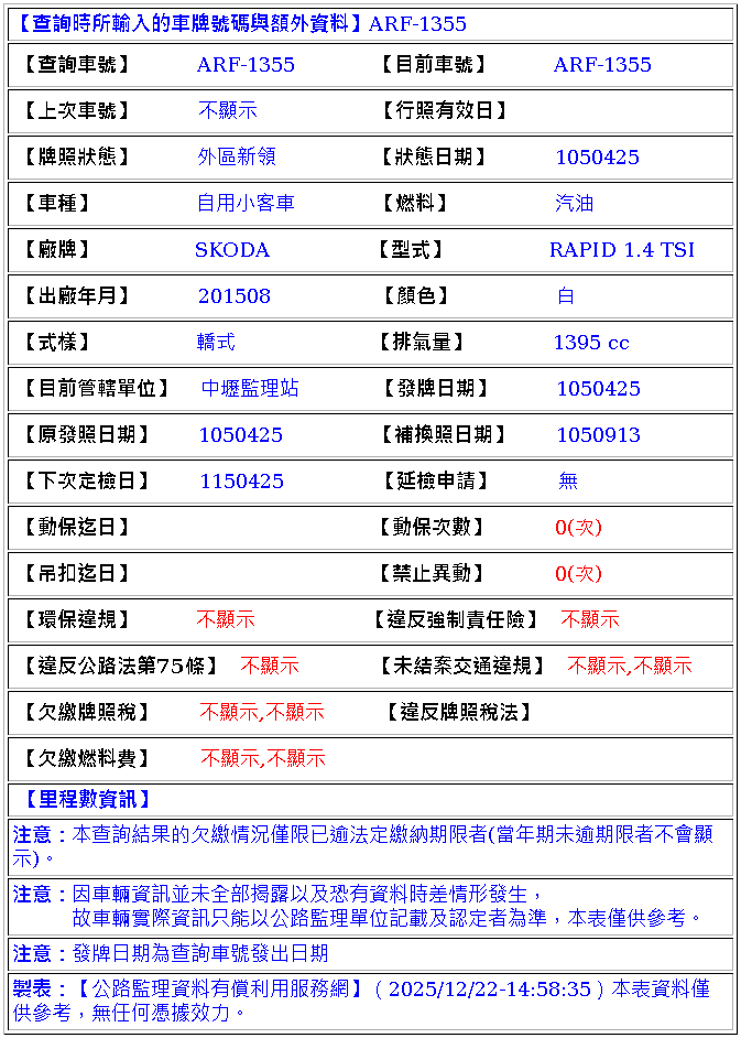 2015年08月出廠 2016年4月25日領牌 里程: 163776KM