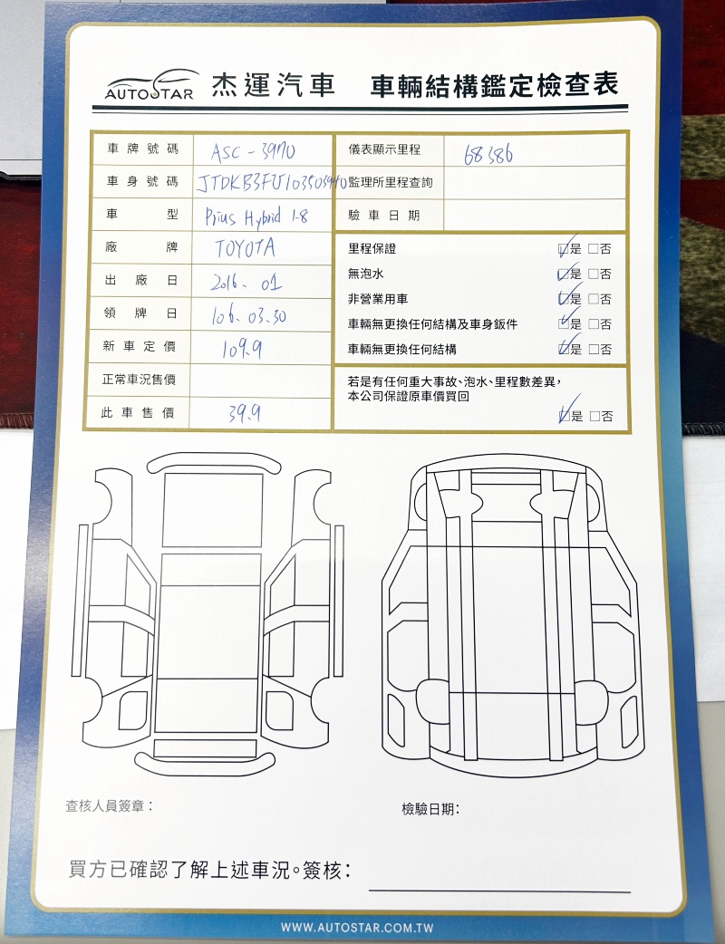 2016年01月出廠 2016年 03月30日領牌 實車里程:68386公里