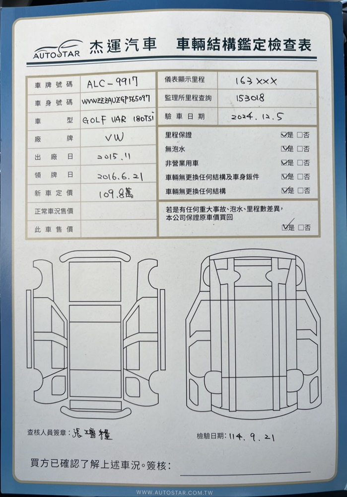 2015年11月出廠 2016年06月21日領牌 實車里程:163714公里