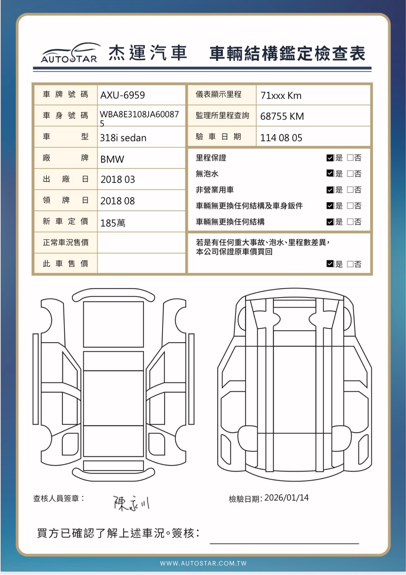 2018年03月出廠 2018年08月24日領牌 實車里程:71239公里