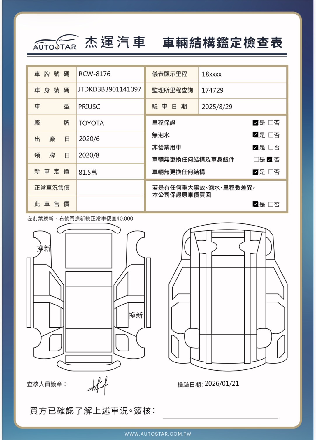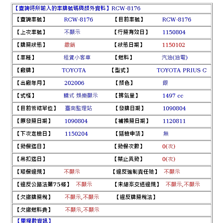 2020年8月4日領牌 實車里程:180720 公里