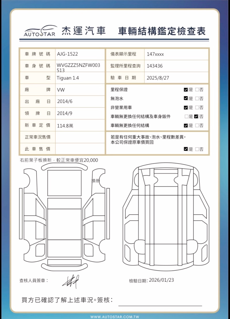 2014年06月出廠 2014年 09月10日領牌 實車里程:148113公里