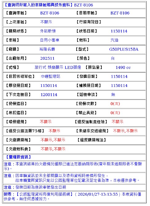 2025年11月出廠 2026年01月14日領牌 實車里程:109公里