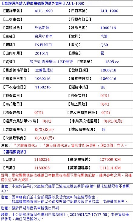 2016年11月出廠 2017年02月16日領牌 實車里程:140969公里